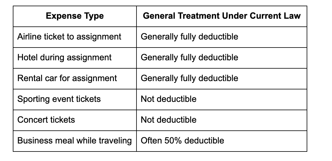 The key takeaway: meals and entertainment are treated differently under current law. (Note: A temporary 100% deduction for certain restaurant-provided meals expired after 2022; the standard 50% limit now applies to most business meals, including travel and client meals for independent contractors.)